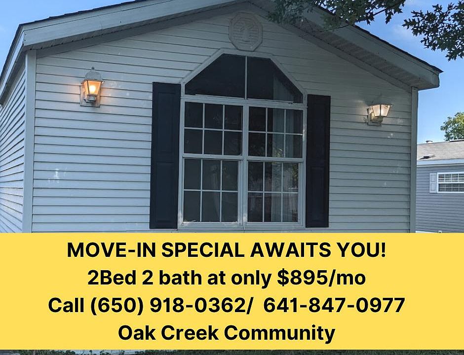 Move-In Special Awaits You! Refundable Application Fee! Limited Time Offer!1 Book your appointment TODAY! Owning a home without crashing your savings? Oak Creek MHP is your choice Newly renovated 2-bedroom, 2-bath at only $895/mo (includes home and lot rent) Well equipped kitchen The spacious home is a perfect fit for your family! Get a pre-approved Loan in less than a minute* Walmart -5 minutes away Lacey sports park -3 minutes away Oskaloosa Elementary Schools, Oskaloosa Middle/Highschools, William Penn University at close proximity Take advantage of this special offer!! Book your appointment NOW Experience accessible and peaceful living at Oak Creek Community Address: 1713 Pella Ave, Oskaloosa, IA 5257