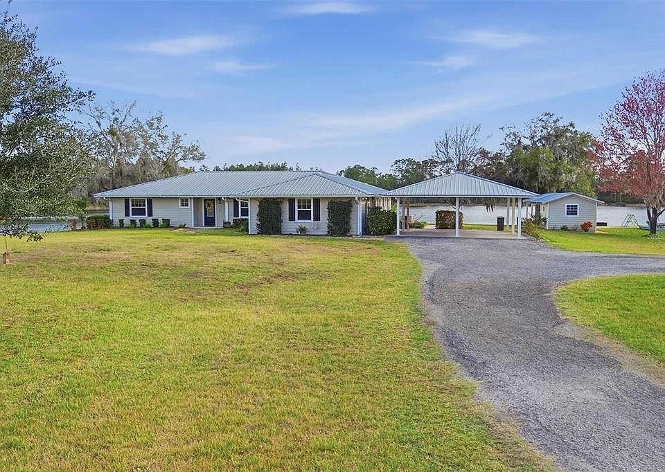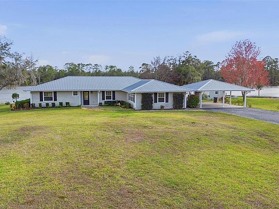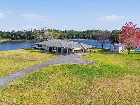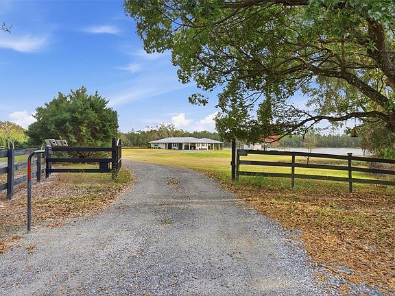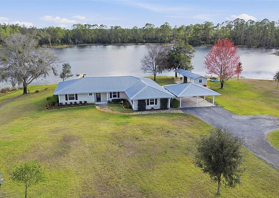 Set behind a private gated entry on 4.33 breathtaking lakefront acres, this exceptional 4-bedroom, 2-bath, 2,663 sq ft estate offers a rare blend of refined living, privacy, and natural beauty—just minutes from the charm of downtown DeLand. Designed to capture panoramic water views, the living room is lined with expansive windows overlooking the lake, creating a stunning backdrop and flooding the space with natural light. Rich wood flooring throughout the home adds warmth and timeless elegance. The chef-inspired kitchen is both functional and inviting, featuring stainless steel appliances, a built-in oven, spacious center island, and an eat-in dining area ideal for everyday living or entertaining. The luxurious primary suite serves as a private retreat, complete with serene lake views, oversized windows, custom built-ins in the walk-in closet, and a spa-like ensuite bath showcasing a soaking tub, beautifully remodeled walk-in shower, and dual vanities. Additional interior highlights include an indoor laundry room and thoughtful layout offering comfort and flexibility for family or guests. Outside, the property continues to impress with a metal roof, whole-home Generac generator, covered 2-car carport, detached shed/workshop, and a private wood dock extending onto the lake. The expansive screened-in back patio provides the perfect setting to unwind or entertain while enjoying tranquil water views and unforgettable sunsets. This is lakefront living at its finest—private, peaceful, and effortlessly elegant.