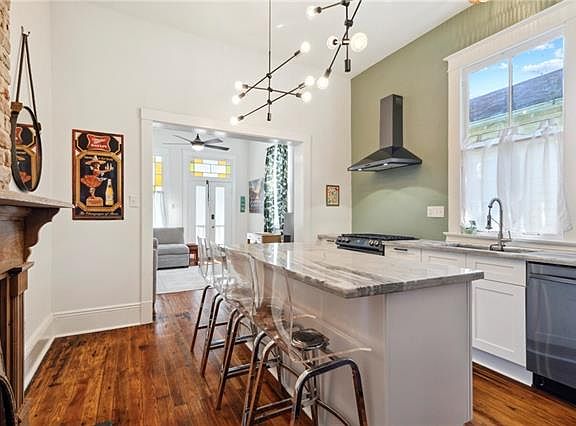Craftsman double shotgunTankless water heaterGas rangeQuartzite countertopsCentral airRecently updated kitchenRefinished original wood floors