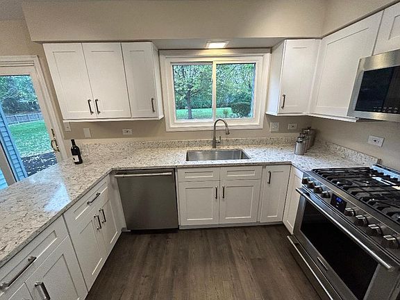 This maintenance free home situated on a cul-de-sac .57 acreage lot, with a full finished basement in Downers Grove. This well maintained home features 3 bedrooms 2.5 baths. Home offers 2931 sq. ft. of living space on 3 floors. Main floor has a living room, spacious family room with gas fireplace. Newly remolded Kitchen white custom shaker cabinets and features a large eating area with sliding doors that lead to the concrete patio. New high end stainless steel appliances. Separate formal dining room. The spacious master bedroom has a ensuite bath & walk in closet. Freshley painted, Brushed Nickel fixtures throughout the home, New carpet, flooring, ceiling fans. The finished basement features a recreation room, office area. HVAC 2022, professional landscaping 2023. Other upgrades to the home include vinyl windows & sliding glass doors, shed in the back yard, great for storage. The large fenced in backyard, is perfect for entertaining, has 16 x 22 concrete patio to spend your relaxing evenings outside. Home being couvade as-is. Close to parks, easy access to expressways, restaurants, & golfing. Located in the Downers Grove South school district.