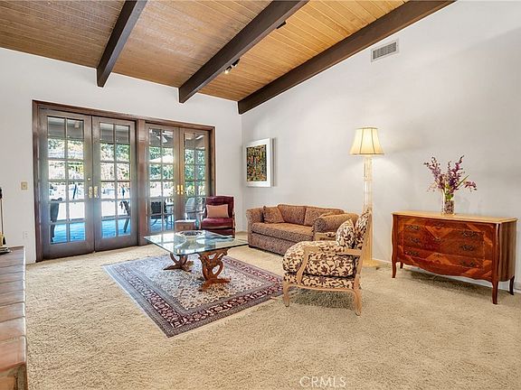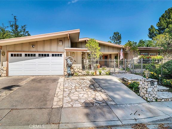 Fantastic, 4 bed, 4 bath, 3,683 sqft ranch-style, mid-century modern jewel situated on a quiet residential neighborhood, south of the Boulevard in the hills of Encino. Striking architectural details display classic roof line, paneled siding, and stone façade and makes for great curb appeal! Original mid-century touches inside, such as wood floors, exposed beam ceilings, and so much more carry the aesthetic inside. Private, gated front courtyard leads to formal entry opening to versatile living area. Formal dining room features large, curved solid glass window and mirrored walls to bring the natural light inside. Living area is dominated by a substantial, double-sided fireplace faced with natural stone which splits two living spaces, which feature pitched, high, ceilings with exposed beams, a full wet bar, and double French doors out to back patio. Generous, light-filled updated kitchen offers recessed lighting, tile floor, granite counters, a butcher block island, abundant cabinets for storage built, and cozy breakfast bar. Utility area off kitchen features laundry hookups, storage, and access to back yard. A private bedroom, offering ceiling fan and mirrored closet with access to full bath would be an ideal private guest suite. Down the hall at the other side of the house are the rest of the bedrooms, including one that has been converted to a library with wood paneling, built-in shelving, and a rolling ladder. Other bedroom features a ceiling fan, mirrored closet, sizable window, and direct access to an updated ¾ Jack & Jill bath with double sink vanity. Impressive master suite boasts private French doors out to backyard, enormous walk-in closet, luxurious ¾ en-suite with step-free shower and double-sink vanity, and direct access to additional room ideal for use as private gym or nursery. Over 18,000 sqft lot results in sprawling yard with covered patio, and several additional seating areas, covered and uncovered, built-in bbq area, pool, private putting green, decorative pond and fountain, and mature trees and landscaping, resulting in a private oasis and retreat, perfect for recreation or entertaining. Attached 2-car garage has direct access to the house and additional parking in the wide driveway, including possible RV or Boat parking. Shopping and dining on Ventura Blvd just minutes north. Location, in easy proximity to both the city and the valley, near the Lake Encino preserve, hiking trails, Braemar Country Club, and the Skirball cannot be beat.