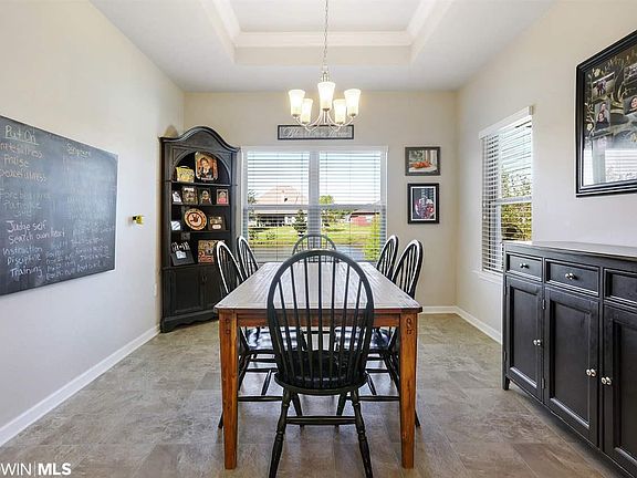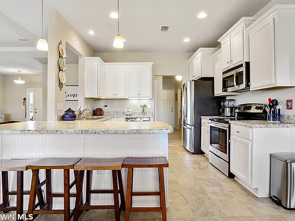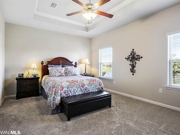 LAKE FRONT home in Wellborn Lake Estates! This great home is a 3 bed/ 2 bath split floor plan with rain gutters and an all brick exterior. Enjoy the stunning sunsets from the lakeside covered patio! The kitchen is light and airy with white cabinets and stainless appliances. Pendant lights add a polished look over the spacious bar. This home also features a wood burning fireplace, tray ceilings, crown molding and living room & patio are wired for surround sound. The yard is beautifully landscaped and well manicured. This Foley home is conveniently located within minutes of our snow white beaches, dining, and shopping. Schedule your showing today!