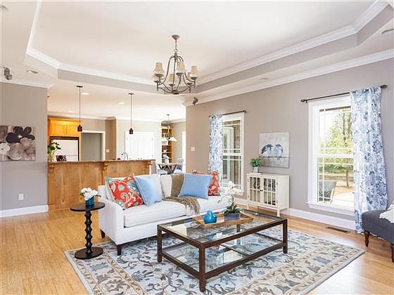 Incredible Custom home features 4 bedrooms, or 3 bedrooms plus study and 2.5 baths. This 1 level ranch home shows like new and offers 9' ceilings and solid bamboo hardwood flooring throughout. Formal dining features glass french doors, gorgeous molding and leads to open eat in kitchen. Kitchen features solid maple cabinetry, tons of built in organizers including spice racks, pull out pot drawers, 2 pantries, and 2 work sinks! Family room offers surround sound, and is open to eat in kitchen...