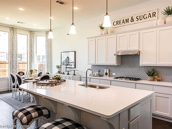 MLS# 14315503 - Built by Highland Homes - August completion! ~ Master bedroom with bright sunny bay window, master bath in designer tiles with garden tub and separate shower, contemporary kitchen with large white quartz countertop ready to seat 7 around, white cabinets, built-in gas cooktop, and wall mount oven and microwave, large dining off kitchen, extended patio to be seen from family room, with 3 piece sky blue tile surround.