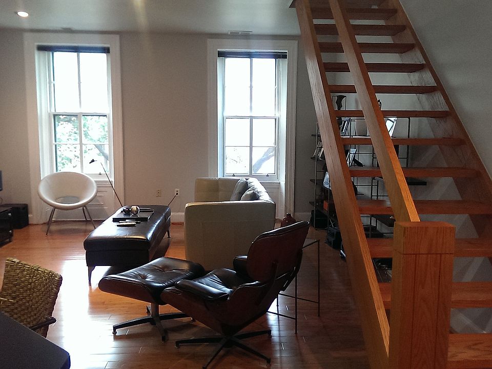 This 1100 sq. ft. bi-level unit, in a historic brownstone building, is located on one of the most charming blocks in the Spring Garden-Fairmount neighborhoods. Walking distance to center city, and a short walk to restaurantsshopping on Fairmount Ave, North Broad, and Callowhill. Convenient to Broad street subway and two bus routes. The spacious and recently rehabbed 1 bdrm., 1.5 bath apartment is a beautiful balance of modern design and historic details. Bamboo floors throughout, high ceilings w/recessed lighting, working fireplace, central air and washer/dryer in unit. Kitchen has black quartz countertop, with black appliance package and tile back-splash. The apartment has lots of natural light (including 2 skylights) and ample storage space, including walk-in cedar closet and personal basement storage. Newly re-modeled bathrooms and a large Jetted tub. Private roof-deck w great skyline view and a small porch off the kitchen. Call 267-626-9504 to arrange a showing 1 month security deposit. 1st and last month due at move-in