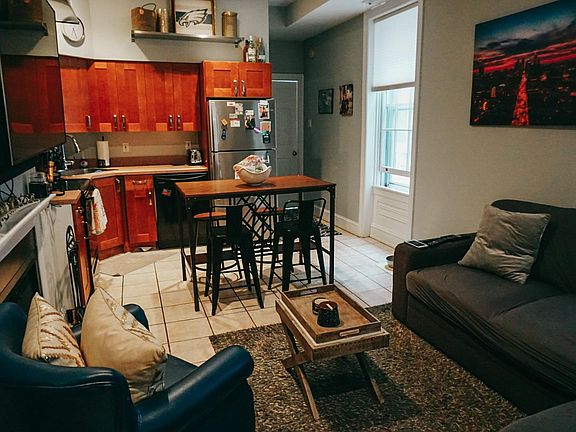 Beautiful one bedroom condo in the Art Museum Area. This second floor unit is in a well maintained brownstone on tree lined Green Street. The open floor plan and high ceilings makes this unit feel spacious. The living area is highlighted by a wood burning fireplace. The large kitchen has lots of cabinets and counter space. A hall leads to a nice sized bath and a light filled rear bedroom with a full wall closet and city skyline views. The unit also features a washer/dryer, coat closet/storage area, and 6 large windows to bring in lots of light. Close walk to center city, subway, new Whole Foods and many restaurants. Convenient to Temple University and Drexel Medical School.There is a spacious storage unit downstairs. Upgrades include new flooring (not pictured) and window treatments. Don't miss out on this amazing space in the best location! Owner pays for water. Renter is responsible for electric and wifi/cable. Pets allowed