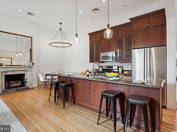 Residence No. 5 at 1714 Spruce Street is a wonderful two-bedroom luxury condo with gated parking in the desirable Rittenhouse Square neighborhood. Situated on the third floor of a handsome and wide brownstone, behind the ornate pediments and classic wooden doors, No. 5 offers a sophisticated and relaxing urban living experience. Upon entering, you will be greeted by a spacious open living and dining area, seamlessly integrated with the chef's kitchen. The kitchen boasts tall wooden cabinetry with upgraded hardware, granite countertops, stainless steel appliances, and an expansive central island with contemporary glass pendant lights. A marble-framed gas fireplace, candle style chandelier, and gilded oversized mirrors are perfectly paired and accentuate the already grand living area. The sunny sitting room is complete with an oversized window and a glass door that leads to an outdoor landing. Back inside, original hardwood floors are newly refinished and lead from the living area to a wide hallway that contains the first of two full bathrooms. With dual exposures, the hallway allows for a cross breeze through the expansive condo that has been freshly painted, from front to back and floor to ceiling. The tiled hall bath features a glass-enclosed shower and pedestal sink. A convenient storage closet is also located in the hall, on the way to the bedrooms. The large primary suite is perfectly charming and features a second gas fireplace with marble surround and chandelier that vie with twinkling city lights for your attention. The marble en-suite bathroom is a true luxury, complete with a soaking tub, separate glass-enclosed shower, and dual vanity sinks adorned with upgraded chrome hardware. Just outside of the en-suite are closets that house the front-loading LG ThinQ front-loading washer and dryer as well as the resident’s clothing. A second bedroom with tall ceilings is located off of the central hall and features an oversized window and interior closet. This residence comes complete with an on-site GATED PARKING SPACE and additional storage space in the building’s basement. A Nest thermostat and smart entry intercom add to the list of conveniences. This exceptional property is on par with the neighborhood that envelops it: Rittenhouse Square. Stop for fresh flowers, artisan cheeses, handmade chocolates, and the like each Saturday, at farmer’s market on the Square. Grab a morning coffee at La Colombe, visit Parc for lunch, and stroll Philadelphia’s prime shopping corridor on nearby Walnut Street. Amenities are abound with a Rittenhouse Square address, and it will be a pleasure to show you this exceptional property.