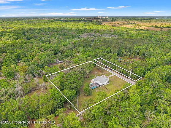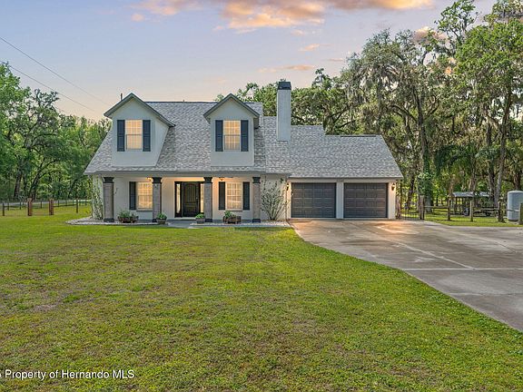 ACTIVE UNDER CONTRACT - ACCEPTING BACK UPS! Welcome home to this one-of-a-kind 3-bedroom, 2-bathroom, pool home, with a multi-useful loft space in the heart of Brooksville. This home is quietly tucked away on a corner lot, on 2.10 acres, fully fenced and zoned agricultural, so you can bring the toys and the hooved friends! Walking up be greeted with amazing curb appeal— a long driveway, basketball hoop and charming front porch, with a country style entryway, making you feel as if you have stepped outside of the Sunshine State! Walking in, the living room opens to the downstairs shared spaces, with wood floors, loads of natural light and custom built in shelving with the first of 2 wood burning fireplaces. The dining room, backs up to the kitchen, featuring gorgeous granite countertops, wood cabinetry with pull out drawers and stainless steel appliances. There is a large pantry, extra cabinets and views of the serene pool area. On one side of the home, ideal for privacy, is the owners retreat, with tray ceilings, an oversized walk-in closet, French doors leading you to the pool area, and a two-sided wood burning fire place, opening into the owners bath, where the other side of the fireplace is nestled above the soaker tub, for the most calm and tranquil baths and relaxation. This space has double vanities, a stand alone shower and a Jack-and-Jill pass through for the laundry area, where there is additional storage and a laundry tub. On the opposite side of the home, is two spare bedrooms, with ample closet space and a shared bathroom, with granite countertops and a shower/tub combo. Upstairs, you will find the loft, this versatile space is great for an extra bedroom, craft room, gym or playroom— the possibilities are truly endless! The beautiful laminate flooring compliments the upstairs paint perfectly and there are two window nooks, the ideal spaces to make an office or homework station! There is also an oversized storage closet! Stepping outside be in awe of the peace and serenity that Brooksville has to offer. The paver lanai (31x18) stretches around the heated salt water pool (2022), having the perfect amount of sun areas and space for seating underneath the shade— for those hot summer days. There is also a large concrete area (12x28) outside the pool— a great spot for a fire pit or a grill! Other great features of this home? Newer roof (2023), newer interior paint (2022), the pool pump and salt cell rod is only a year and a half old, and the home has 4 cameras and a ring doorbell for added security! Inside the fenced in yard, there are 2 sub fenced areas-- for grazing animals, a large poll barn (32x20)with 2 livestock paddocks and attached shed and a dog kennel (12x8), which has electric and lights— and could easily be transformed into a chicken coop! The yard also has a large raised garden bed, where you can have fresh produce year round! Lastly, the home is on a well, with a water softener! With over 2,480 square feet, no HOA, no deed restrictions or CDD fees this home will not last long! Call today for your private showing!