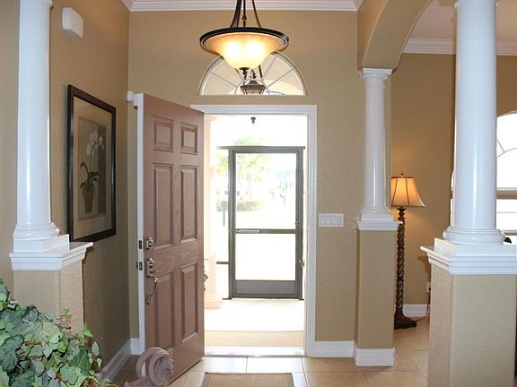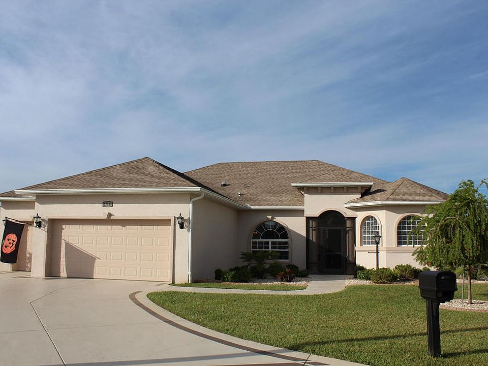 Located in Beautiful STONECREST, a 55 Gated Golf Community ONLY 3 Miles North of THE VILLAGES, FL! CUSTOM Built in 2014 CBC/Stucco home LOADED with extras! Screened Front entryway! The Kitchen boasts Granite counter tops, SS LG appliances w/convection oven, Pull-out Shelving, Soft close drawers, 42'' Cabinets w/under Cabinet Lighting, Island and Breakfast Bar w/4 Pendant Lights! Coffered Octagon Tray Ceiling in Living Room w/recessed Lighting! Crown Molding throughout! Master w/Sliders to Lanai, Dual Granite Vanities, Soaking Tub and Separate Tiled Shower, Dual Walk-in Closets! Safe/Storage Room! Decorative Painted Driveway leading up to the OVERSIZED 2 Car PLUS Golf Cart Garage w/metal Pull down Stairs to attic! Private Pool w/Waterfall under Birdcage with Remote Sun Shades on