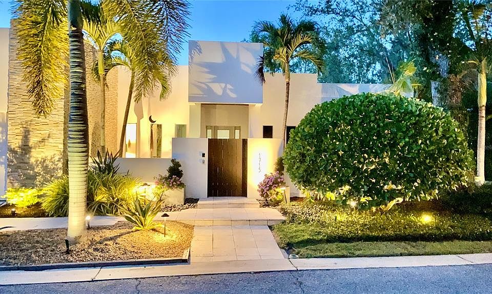 A Modern Classic. Timeless. Simple. Elegant. Unique. The Bonita House was built in 2010 and was an exciting collaboration between the architect, owners, designer, and builder. Her modern architecture is at once beautiful, unique, and some say, breathtaking! Enter the wood gate to the charming zen-like courtyard where you will be delighted to find a granite fountain; a marble bench, palm trees, and flowers to welcome you in. Once inside, the home will wrap you in its warmth. It all comes together with smooth finish walls, Brazilian walnut hardwood floors, high ceilings, 8’ solid core birch doors and 8’ sliders out to the welcoming lanai. The heart of the home is the great room which has a stone accent wall with a custom walnut floating cabinet. The separate dining room, is open to the great room, and a waterfall chandelier, sets the pace for a relaxing dinner with family or friends. The chef’s kitchen is complete with Thermador appliances, gas cooking, tile backsplash, granite countertops, and custom white oak cabinets and drawers. There’s a wine storage unit that holds 120 bottles and a smaller one for 30 bottles. The right-wing houses the owner's suite and has a walk-in closet with built-in drawers and shelves. There is another very large reach-in closet. The owner’s bathroom has two sinks, a vanity, and a large walk-in shower with two shower heads. On the opposite side of the home, there are two bedrooms. One has an en-suite bathroom with a tub and shower and the other has easy access to a large bathroom with a walk-in shower. All three bathrooms have 18” porcelain tile and rift cut custom walnut cabinets. The office or den has fixed windows facing the relaxing courtyard. From the great room or kitchen you will have access to the 400 sq. ft. covered and screened lanai through 8’ sliding glass doors. There you will find an outdoor kitchen, a cozy fireplace, and travertine marble floors. The slider from the great room opens completely, blending the outdoors with the indoors. From the lanai, you have access to the pool with its soothing fountain wall. The stone on the exterior and interior provides a unified experience when transitioning through the home. Now, you’ve found a beautiful and unique place to live that’s close to Trader Joe’s, Red Rock Park, Publix, Siesta Key, Sarasota Bay, Fine Dining, and Downtown. You can walk or bike to anything you need!