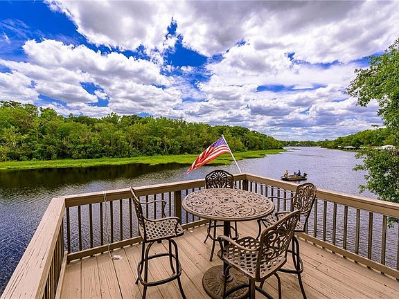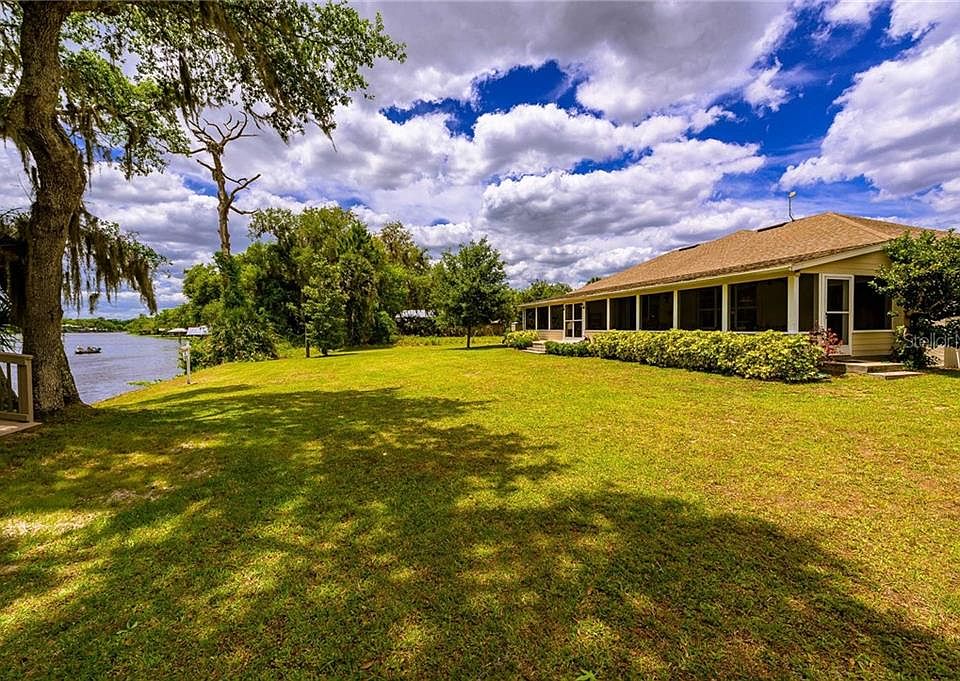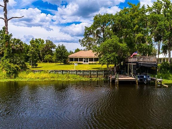 Custom waterfront home on 1 acre hovering high above the St. John's River on Morrison's Bluff. There are only ten residential lots here on Camp South Moon Rd. featuring this extraordinary elevation offering high ground and commanding views of the serene ''no-wake'' waterway and the natural preserve of Morrison Island on the opposite shoreline. Constructed in 2000 of solid block, the home features over 3500 total square ft. including a fabulous open air, outdoor living room that sprawls 57' along the riverside. Inside you will find a large eat-in kitchen that opens across a breakfast bar into the waterfront great room with vaulted ceilings and plenty of window space that frame the water vistas. A private waterfront master with French doors lead out to the lanai, has a cavernous walk-in closet, and a generous bath with soaking tub, double vanities and water closet. Beyond the two sizable guest rooms is a dedicated office (could be a 4th bedroom) and a formal dining room. Indoor utility room leads to the two car attached garage and a detached garage serves as the owner's workshop and man-cave. The custom built dock and sea wall features an incredible 2nd story entertainment patio for panoramic views of the river and the nightly sunset show. The lower level of the dock is home to the boathouse and a beautiful waterside sitting area where plenty of fish have been landed. This is one of very few properties in Astor that sit "high and dry" requiring no flood insurance. Just a short boat ride to waterfront restaurants, majestic Blue Creek and amazing Lake George with scenic Silver Glen Springs...this location is simply unbeatable. Scenic Camp South Moon Rd. is paved and cuts through the surrounding State Forrest offering wildlife sightings and creating the feel of a true country setting for the few fortunate full time residents and seasonal home owners. Truly the best offering on the St. John's and priced to sell!