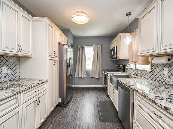 concrete pad connecting the home to the garage, perfect to set your grill & outdoor furniture on. Inside, you'll be amazed at all the square footage it offers. The owner's bedroom is on the main level (currently with a king-size bed) and just beside the main level updated bathroom, with subway tile, new stone vanity, and soaking tub. Arched doorways lead you from room to room. The formal dining room leads you into the stunning kitchen which has had a full renovation, all new cabinets, SS Samsung appliances, Farmhouse sink, granite countertops & Tile backsplash, and flooring. Original hardwood floors are in excellent shape on both the main & upper floors. Upstairs is an updated half bathroom and two more sizable bedrooms. The basement is ready to entertain with a large open area for watching movies, a card table for playing games, or whatever you can imagine. The basement bedroom has a new large egress window that allows in so much light. Next to that is another full bathroom with a soaker tub, new vanity & also connected is the laundry room. ALL NEW windows & BRAND NEW HVAC, this home is in exceptional shape and ready to greet its new owners.