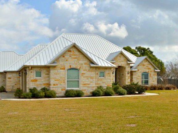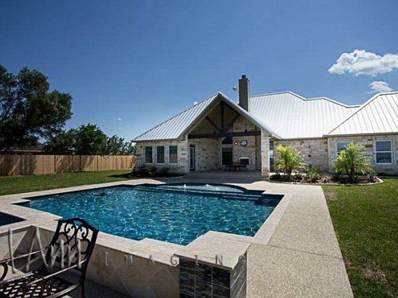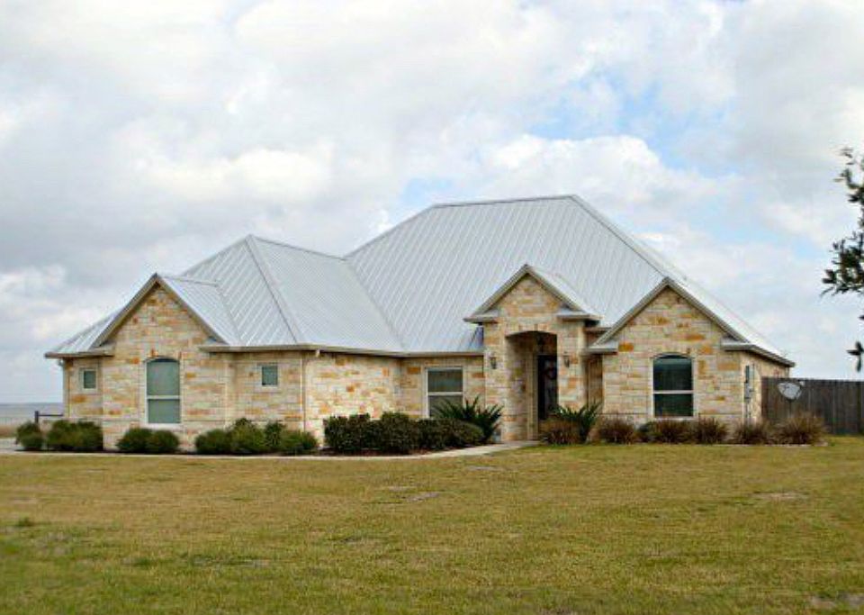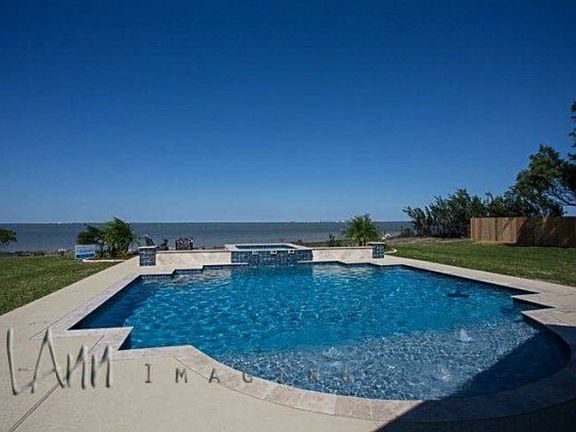 Custom built waterfront home on 2.5 acres with private beach and pool. Home was featured in the 2014 parade of homes and won best exterior design. Home offers 5 bedrooms 3.5 baths with large open kitchen and living areas. Kitchen has custom alderwood cabinetry with granite countertops throughout and stainless steel LG appliances and large walk-in pantry. The living room has cathedral ceilings with beautiful stone fireplace and large windows overlooking pool and Lavaca bay. Master suite has coffered ceilings and large master bath with large walk-in shower and closet. Bonus game room. Backyard has large covered patio with fireplace, pool with hot tub, large completely fenced yard, and private beach.