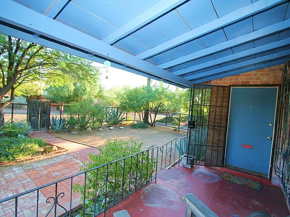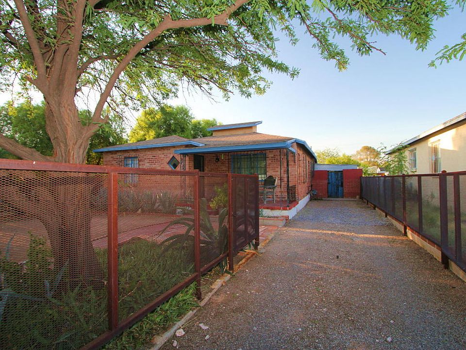Jefferson Park Historic charmer priced to sell - easy biking to U of A and near the CAT TRAN. This is a classic 1948 brick home with important upgrades in floor plan as well as 200 amp electric service and main wires all underground to TEP box, new plumbing under the house, newer appliances,gas range, concrete counters. Entire back yard securely fenced with new storage shed. Charming rusted steel fencing in front and across the back. Landscaping low care and on drip with a small patch of grass. Off street parking for 2 vehicles. Mountain views and close to all conveniences as well as the University and Banner Medical Center. Easy show but need notice to crate the dogs.