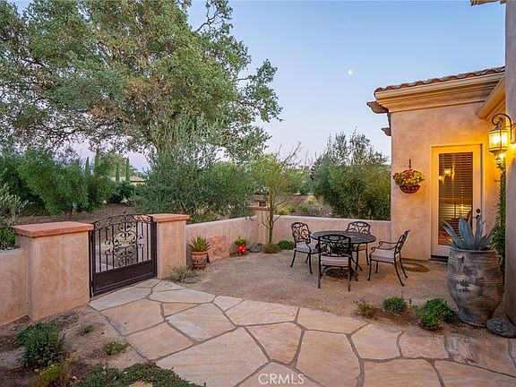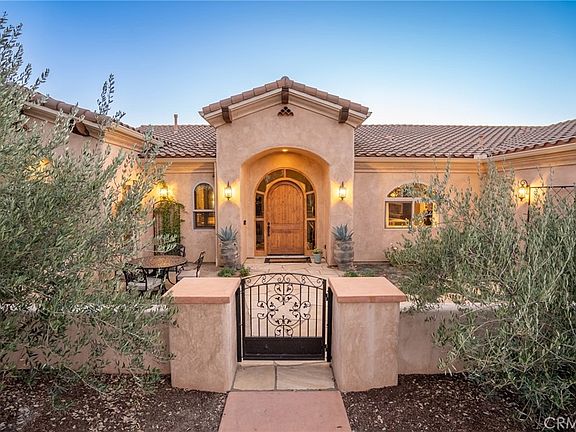 Masterfully designed and renovated to perfection this 3,314± sq. ft home located in Santa Ysabel Ranch Estates offers unmatched views and exceptional detail. The interior of the home features new Italian tile and hardwood floors, paint, lights, vanities and fixtures. Filled with refined finishes of custom natural earthen clay finish in living room, custom handmade iron and alabaster light fixtures, Murano glass fixtures and Turkish sink basin and iron vanity in powder bath. Complete with 4 bedrooms, 3.5 bathrooms, generous laundry room and attached 3 car garage. With a grand first impression you are welcomed by a secluded front courtyard onto the foyer that leads into the living room, dining room, kitchen and bedroom hallway. An inviting and effortless floor plan, the living room opens onto the kitchen with French doors that lead to the back patio space. The gourmet kitchen showcases quartzite counters with unfinished edges and all stainless-steel appliances including a Wolf gas range, Sub Zero refrigerator, double oven and a custom walk-in pantry. The lavish primary suite includes a gas fireplace with beautiful rock finish, spacious walk-in closet and luxurious bathroom with a soaking tub, custom tiled shower and dual vessel sink vanities. This captivating custom residence sits on a lot with a 180-degree view overlooking Paso Robles and Templeton and offers breathtaking sunsets. The exceptional outdoor living space is complete with an outdoor kitchen with custom pizza oven, fire pit and water feature overlooking the 80± olive producing trees. The estate homes of Santa Ysabel ranch offer luxury living with 24/7 gated security, tennis courts, walking trails and private SYR Mutual Water Company all within minutes of downtown shopping, dining and award-winning wineries.