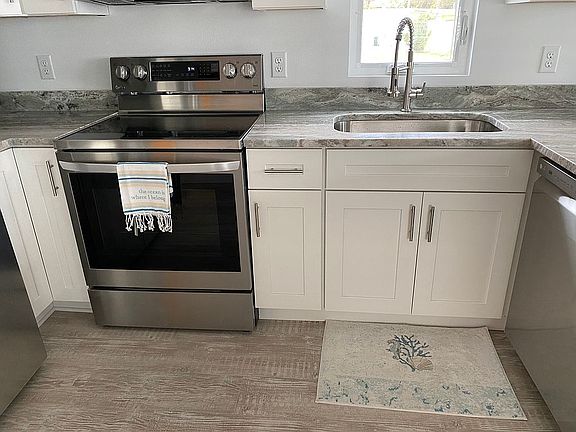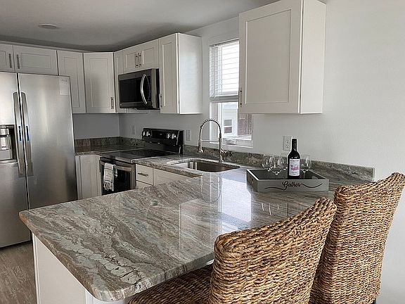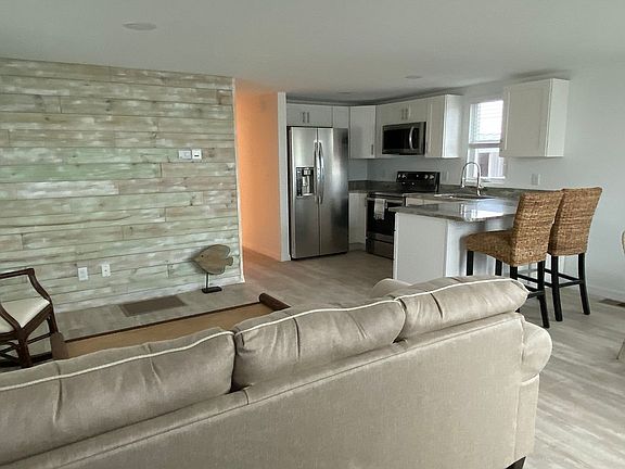 Sit on the front porch and enjoy the water view. What a nice breeze! This home is completely renovated with new plumbing, electrical, AC/heat, windows, doors, siding, foam insulation, drywall, flooring, tile bathrooms, walk in shower in master, inside laundry, big master closet and new kitchen with stainless appliances and peninsula with seating. Carport will fit two vehicles, or convert back half to a screen room for outside entertaining. Decorated with a coastal flair. All you need to do is move in. Welcome home
