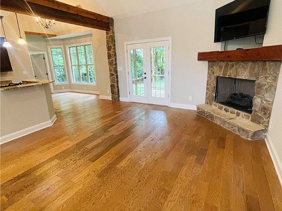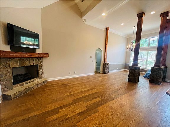 - Description: stone fireplace w/ gas, vaulted ceilings with stone and cedar columns,Flooring: Wood