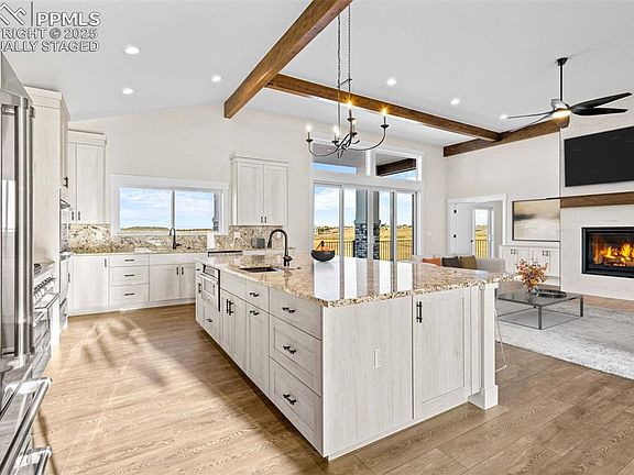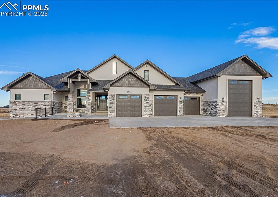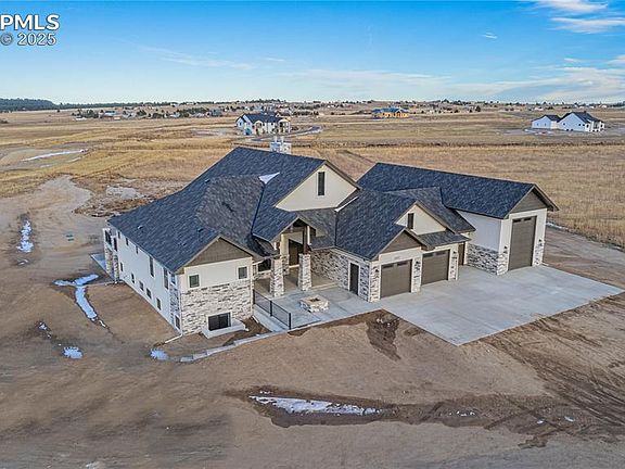 New construction. Never lived in. Discover your dream home in this exceptional ranch-style property that offers a lifestyle of luxury and convenience. A true gem, this home sits on an expansive 5.01 acres, tucked away on a quiet street. From this exclusive location, you'll enjoy breathtaking views of Pikes Peak, creating a picturesque backdrop for your daily life. As you step inside, you'll be welcomed by an expansive open floor plan. The grand room is a showstopper, complete with an elevator for ease of access, a cozy fireplace to gather around, and a hidden pantry that's both practical and discreet. The custom cabinets and elegant granite countertops in the kitchen add a touch of sophistication, while the walk-out deck, spanning an impressive 51 feet, invites you to soak in the serene outdoor views. The main level boasts three spacious bedrooms, each designed for comfort and style. The owner's retreat is a true sanctuary, featuring a fireplace as well as direct access to the deck. The primary bath is a spa-like haven, equipped with a luxurious spa shower, a freestanding tub, a heated towel rack, and double vanities for added convenience. A generous walk-in closet, complete with a built-in closet system, conveniently attaches to the main level laundry room, which features granite countertops, a sink, and space for a full-sized refrigerator. Venture into the walk-out basement adding another layer of convenience and charm to this exceptional home. The family room is a fantastic space for entertaining and relaxation, and it includes a full-sized kitchen for added convenience. A finished storage room doubles as a safe room, providing peace of mind. You'll also find three additional bedrooms, each with their own en-suite bathrooms, ensuring comfort and privacy for everyone. This home is the epitome of elegance and functionality, offering an extraordinary blend of luxury and practicality. Large outdoor entertaining spaces