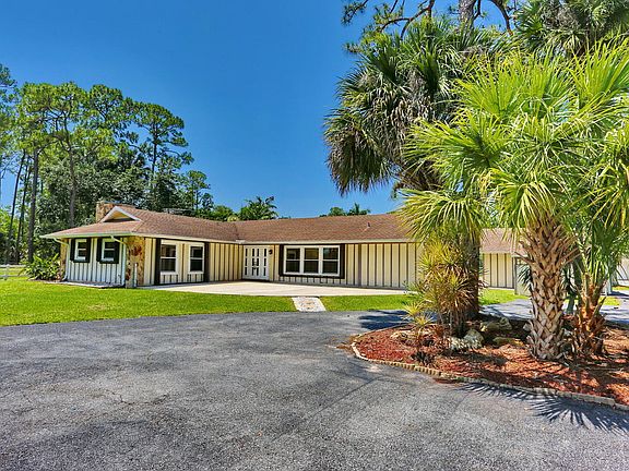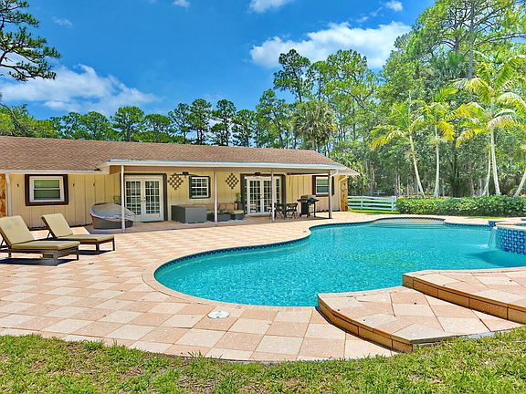 5-acre property fenced and cross fenced in Wildwood Acres of Jupiter Farms. Royal palm trees line the driveway as you enter to a large front porch and circular driveway. This is a Ranch style home with split bedroom floor plan. The master bedroom features on suite bathroom with walk in closet and dual sink vanity. The living room features a wired home entertainment center and wood burning fire place with wood french doors that lead to a deck area. There is a family room which lends itself for many uses of the space. The kitchen is renovated with custom cabinetry and a full pantry. French doors lead out to the pool area with over 1000 sq ft of shell lock pavers. The pool is saltwater with splash over, spa, and oversized first step into pool perfect for a lounge chair. 2 car carport and 2 car detached garage with storage room and overhang area. 1000-gallon sunken propane tank heats the spa and pool by an app on your phone. This home has good bones and the potential is endless Room for horses with a rare 5-acre parcel! All information deemed reliable but not guaranteed.