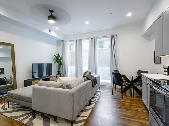A gorgeous, ultra-modern ground floor apartment with floor-to-ceiling windows in the heart of Dupont Circle. This fully furnished 1-bedroom, 1-bath condo features a dishwasher, in-unit washer and dryer, a queen-size bed with a high-quality mattress, web-enabled 42 HD SmartTV, hardwood floors throughout, granite countertops, and stainless steel appliances. Wake up between high-thread-count sheets and raise the blinds to let the light stream in on three sides. Catch up on emails in a home with gigablast Wi-Fi and plenty of workspace. This is a basement unit. This apartment is a turnkey luxury experience, carefully curated and thoughtfully designed with beautiful and comfortable furniture. It includes a fully equipped kitchen, superior quality mattress, and the most comfortable, welcoming linens. Blackout shades or curtains are in every room, and gigablast business speed Wi-Fi is available. Pets are welcome with a fee of $75 per pet per week. A Pack and Play and/or high chair can be reserved in advance for a $25 rental fee. Several parking options are available, and you can inquire about advanced parking pass or parking space reservations. Dupont Circle stands out as a cosmopolitan jewel in DC's distinctive collection of neighborhoods. With a famous traffic circle and fountain at its center, the Dupont Circle neighborhood has been a vital DC community since the late 19th century and continues to be a hot spot for residents and visitors of all ages. Getting there is easy with the Metro Red Line stop, Dupont Circle-Georgetown-Rosslyn DC Circulator bus route, Capital Bikeshare, or by walking. Located just four blocks from the Dupont Circle Red Line metro station (north entrance), this area boasts a Walk Score of 100, making it a true Walker's Paradise with excellent transit and very bikeable. You can walk to many of DC's best boutiques, upscale restaurants, and international casual spots. Don't forget to visit Jenni's ice cream on 14th or check out the abundance of Michelin recommendations just steps from this home! Smoking of any kind is not permitted anywhere in the interior of the building or within fifty feet of the building, including outdoor spaces. A violation of this policy will result in a $500 smoking fee. Parties and events are strictly prohibited. All homes are equipped with noise monitoring devices, and noise levels exceeding normal levels are grounds for ending your stay. Exterior cameras record the exterior and common areas, including all entries to the building. Certain items should not be flushed down the toilet or put down drains, as they may cause plumbing issues, and charges may apply if found responsible. The apartment may require unexpected or scheduled preventative maintenance, and access may be needed with 24-hour written notice. Includes plenty of workspace and gigablast business speed Wi-Fi. A laptop computer is not included.