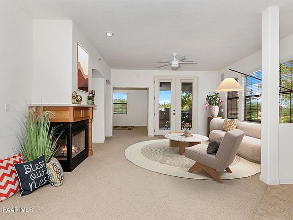 View of the 13th green and lake at Capital Canyon Club Golf Course. Single level living condo Single level, ground floor condo in Alpine Villas at the popular Hassayampa Village Community. Great full time home or seasonal getaway. Spacious rooms include master suite, guest room plus an office/den. Kitchen appliances replaced in 2016 and refrigerator replaced in 2021. Six new Pella windows also replaced in 2016. A wonderful place to call home with open floorplan, private patio and connecting garage. Low maintenance living with optional membership at the Capital Canyon Club. Patio furniture conveys with sale.