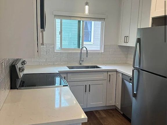 The kitchen is fully remodeled with high-end stainless steel appliances, new shaker-style cabinets, and quartz countertops. A shared laundry room is conveniently located onsite, and covered, off-street parking is available in the back of the property.