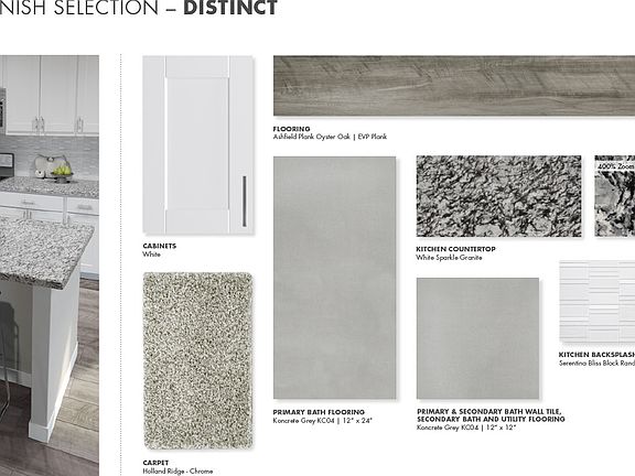 The spacious living area flows seamlessly outdoors to the covered back patio. White cabinets with sparkly white granite countertops, cool grey EVP flooring with greyish brown carpet in our Distinct package.