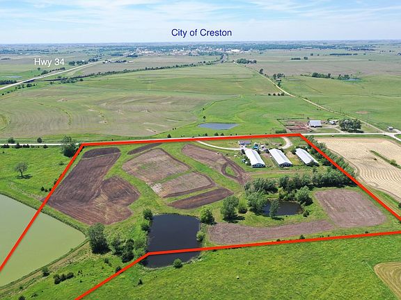 Rural acreage located within 3 miles of Creston! This 17.62-acre property is situated East of Creston less than one mile off Highway 34. There is a 2005 manufactured home that sits on this acreage. It has 3 bedrooms and 2 full bathrooms. Included with this property are 3 buildings previously utilized as swine units that measure approximately 40' x 160'. These buildings are insulated and have cement floors with good curtains and could be utilized for livestock or converted for business use such as storage units! This property includes ~10 crop acres. If you are looking for a place in the country not far from town with a beautiful view of Creston this may be the one!