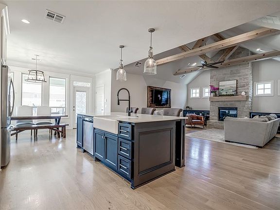 The BEST location in the highly sought-after neighborhood of Town Square! Plus, enjoy the perks of living maintenance free! Across from the playground & a stone's throw from the resort-style pool, rec center & fitness studio, this 3-bedroom, 3-bathroom bungalow is absolutely stunning! The spacious living room boasts a cathedral ceiling with beautiful wood beams & a stacked stone fireplace. Kitchen is a chef's dream with stainless steel appliances, quartz countertops & walk-in pantry. Also, a large island provides additional counter space & a bar big enough for several bar stools. You’ll love the open floor plan which is ideal for entertaining family & friends! The primary bedroom is a true retreat- featuring a generously sized closet that conveniently opens into the laundry room. One secondary bedroom is downstairs- the other upstairs along with a full bath & second living area or home office. Other highlights include some fresh paint, wood floors, covered patio & even your own vegetable garden! Highly ranked Edmond schools. Location is fantastic - East Edmond & minutes from I-35. HOA also includes lawn maintenance, flower beds & snow removal. Town Square is truly one of Edmond’s most desired neighborhoods with the finest of amenities. Come live your best life here!