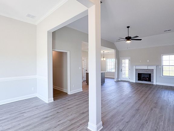 The Cambridge A plan. Entering the home, you will find LVP floors that flow through the halls, kitchen with eating area, dining room and family room with high ceilings. The family room has a gas log fireplace and opens out to your covered porch. The eat in kitchen contains lots of cabinets, granite countertops, and a large center island perfect for stools. On one side of the downstairs, you will find a large master suite with tray ceilings. You walk into a bathroom with a tile shower, stand-alone soaking tub, vanity with two sinks, and a large walk-in closet. There is also an oversized utility room with room for extra storage. On the other side of the downstairs, you will find two more bedrooms and a bathroom. Upstairs is a large bonus room with a closet that can also double as a 4th bedroom. Outside is a nice covered porch where can enjoy the cool fall evenings!