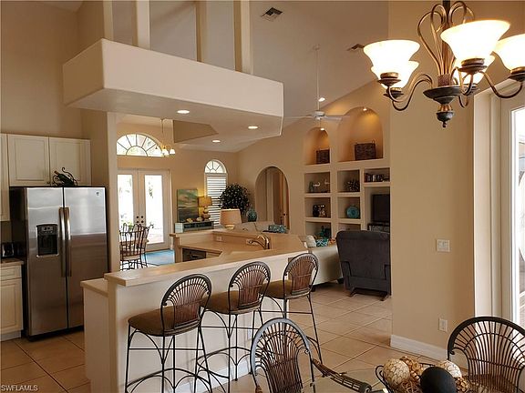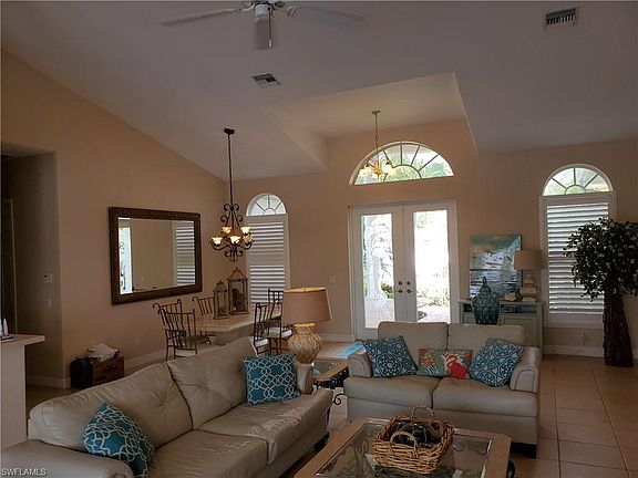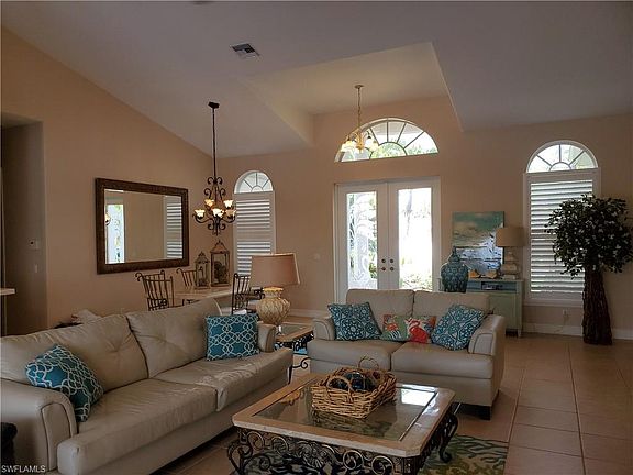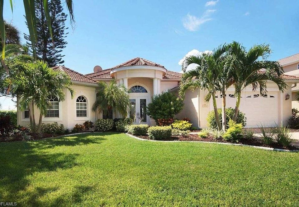 This home is located in the beautiful Orchid neighborhood an area comprised of some of the finest homes in Cape Coral. This home has great curb appeal, double door entry, soaring great room with a wall of pocketing sliders overlooking the pool and 200' wide sailboat access canal. There is southern exposure for the pool and dock providing just the right amount of light and sun on the pool year round. The floor plan is a wide open great room, and an open kitchen which provides a great layout for entertaining. All tile flooring throughout, even the lanai. There is a grand master suite with double door entry and a lavish master bath with garden tub and walk in shower. The second guest bedroom is a mini master, it has a slider to the pool and an en suite bathroom. There are a ton of windows, a tall wall of pocketing sliders all along the back which overlook the spacious lanai. Outdoors there is a large lanai which runs the length of the home, a sparkling swimming pool and an integrated spa. The large boat dock can accommodate your seagoing vessel and features a 10,000 boat lift, a tiki hut and all brand new decking. Be in the river in just a few minutes! Sold turnkey furnished.