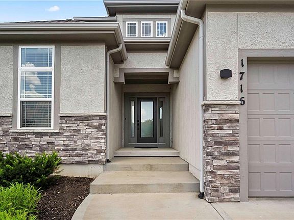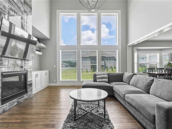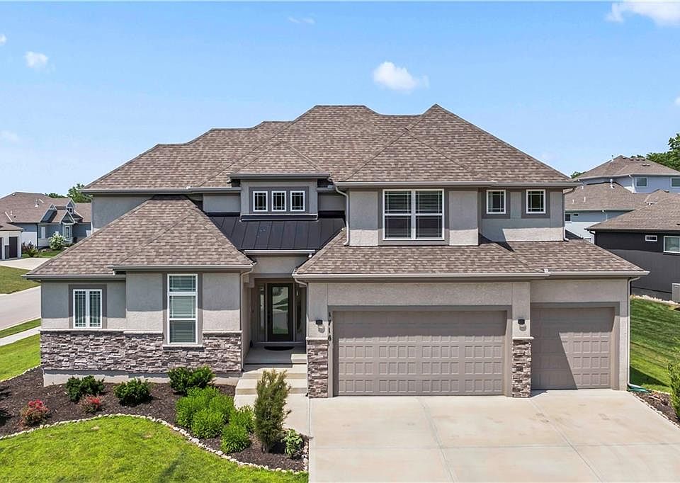 GORGEOUS 1.5 STORY WITH 5 BEDROOMS--2 ON THE MAIN! Open Main Level with Beautiful Wood Floors throughout the living spaces. Impressive floor to ceiling Tiled Fireplace in soaring Great Room! Tons of windows let natural light pour in. Kitchen that is sure to please showcases HUGE Eat-In Island, Elegant Granite Countertops, Pantry, Modern Open Shelves and Stainless Steel Appliances including Gas Cooktop and Built-In Microwave and Oven! Adjacent Dining Room with Patio Access--including built-in Grill--Perfect for Hosting Summer BBQ's! Primary Suite has tray vault ceiling, en-suite with generous walk-in closet, double vanity, separate soaking tub and shower! 2nd bedroom and convenient laundry complete the main. Head up and find a loft area with built-in desks! 3rd bedroom has private en-suite and walk-in closet. Bedrooms 4 and 5 share a bathroom each with their own vanity and walk-in closet! Bonus--2nd laundry room on this level! Full unfinished basement for ALL your storage needs or ready to finish as additional living space with an egress window and stubbed for bathroom! Fantastic location close to shopping, dining and major highways and ALL KC has to offer! Welcome HOME!!!