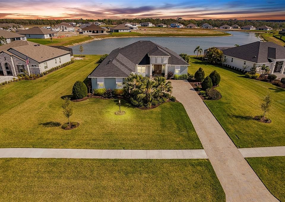 This architectural masterpiece is sure to impress. Highly customized to perfection with impeccable design, high-end amenities and elegance in mind. This fabulous estate features an open floor plan with an abundance of natural light pouring throughout, voluminous ceilings accented with wooded beams, 3 large bedrooms, 3 full baths, executive home office, bonus room/second executive home office/or better yet 4th bedroom, nearly 3000 square feet of exquisite living space on nearly half acre waterfront property. You'll have enough space to make ALL of your dreams come true. The custom designed gourmet kitchen is a chef's dream boasting stunning cabinetry, designer hardware, light fixtures, high end appliances, farmhouse style cast iron sink, coffee bar, barn door style pantry and large center island perfect for entertaining. If outside living is where you prefer, then this home continues to impress. You'll absolutely love the Southeast waterfront exposure and completely customize outdoor living space. The perfect setting for outside dining or just enjoy watching the sun dancing across the water. Relax poolside and enjoy this breathtaking custom saltwater pool with spillover heated spa and panoramic screen enclosure. For the space enthusiast, on those perfect Florida weather days and/or nights, you can even view the Kennedy Space Launches from your own living room or lanai. At the end of a long day, retreat to your spacious yet elegant primary suite and enjoy endless water views. Spacious custom ensuite bath makes this a true sanctuary, complete with free standing soaking tub, double head glass shower, expansive vanity area and an abundance of natural lighting beaming through. All overlooking an expansive yard and breathtaking lake. Location in sought after Twin Rivers community which is conveniently nestled along the historical Manatee River, where you can take your family canoeing, kayaking, fishing, boating, and hiking. Schedule your private tour today. You must see first hand all that this estate has to offer. Your dream home awaits...