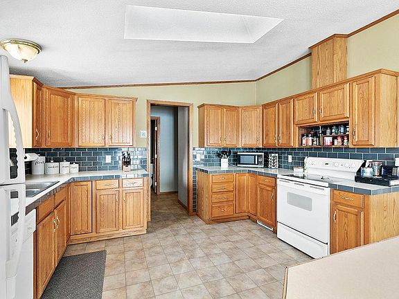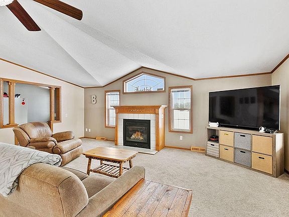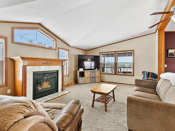 Country home on 5 acres. The 14x27 roofed open porch welcomes you to this three bedroom two bath home. Open floor plan with vaulted ceilings, plenty of kitchen cabinets with work island, owners suite with full bath, gas fireplace in living room, everything on one level. New roof in 2022! Oversized attached insulated garage 26x36!