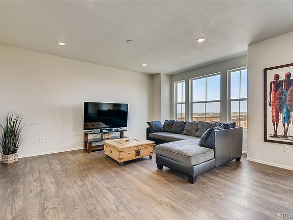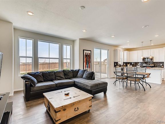 This beautiful home in Buffalo Highlands is practically brand new and ready for you to move in! As you enter, you are greeted with a spacious open-concept living room, dining room and kitchen, which are flooded with natural light from large windows framing views of the Front Range. The kitchen features white 42 inch cabinets, stainless steel appliances, gas range, granite countertops, stylish subway tile backsplash, and kitchen island offering additional seating. A pantry and private powder room complete the space. Upstairs, you'll find a generous master bedroom with tray ceiling detail, ensuite and walk-in closet, two secondary bedrooms, and a hallway bath with double sink vanity. Additional space for home office or virtual learning is located on the landing, and the laundry is on the second floor for your convenience. Downstairs, an unfinished basement is just waiting for your inspiration! Outside boasts an extra-large backyard perfect for outdoor play with a new sprinkler system and landscaping, including a patio for you to entertain and enjoy evening sunsets. Neighborhood backs to Rocky Mountain Arsenal Wildlife Refuge offering family fun with fishing, hiking trails and an 11-mile Wildlife Drive. Easy access to E 470 and Hwy. 76.