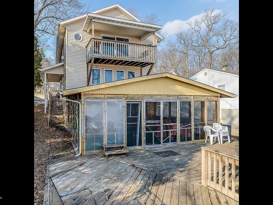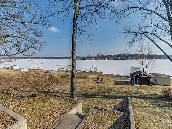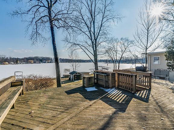 This 4-bedroom, 3-bath, 1,960-square-foot home overlooks beautiful Donnell Lake from a hilltop across a terraced lawn. A large deck with built-in bench, a covered upper deck, a three-season room with exposed beams, and a screened porch offer broad vistas of the lake. The interior features knotty pine walls and ceilings and ceiling fans. The main level includes a living area with deck access, dining area, kitchen with island, two bedrooms, and one bath. Upstairs are two bedrooms, including a large room with fireplace and upper deck access, and one bath. The walkout lower level has a laundry, a bath, and abundant storage space. Outside are a fire circle and a storage shed near the water. Donnell Lake is a 246-acre, spring-fed, all-sports lake 2 hours from Chicago and 30 mins to Notre Dame.