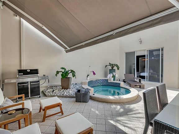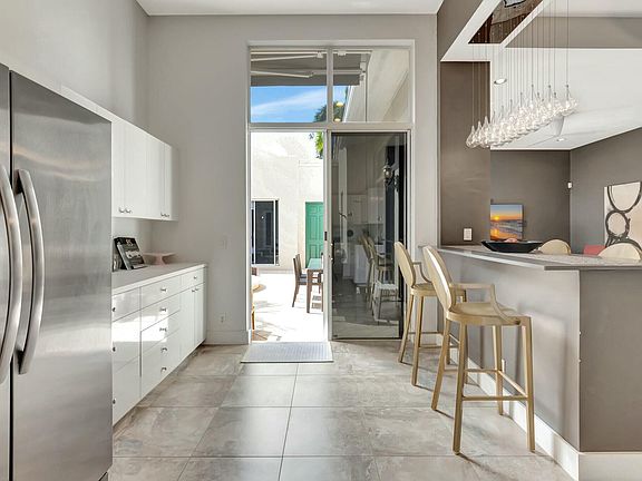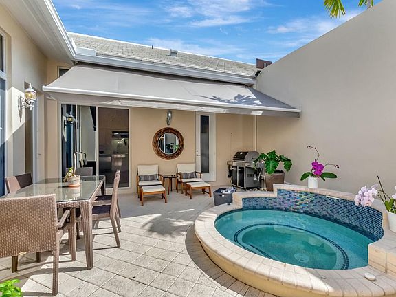 Fabulous 3 bed 3 bath court yard home in Boca Country Club. Soaring ceilings throughout main house that has 2 bed/2 baths that overlook a golf course. White kitchen with quartz bar opens to dining and living room. Large primary bedroom and huge walk in closet with built ins and features an additional dressing room space. Detached guest house has full bath and walk in closet with built ins. Courtyard can be shaded by large retractable awning. Heated Spa with new pump and heater. Roof was replaced in 2019. 2 car garage has coated flooring, washer/dryer and extra fridge. AC and air ducts recently cleaned. HOA fee includes Cable & WiFI.