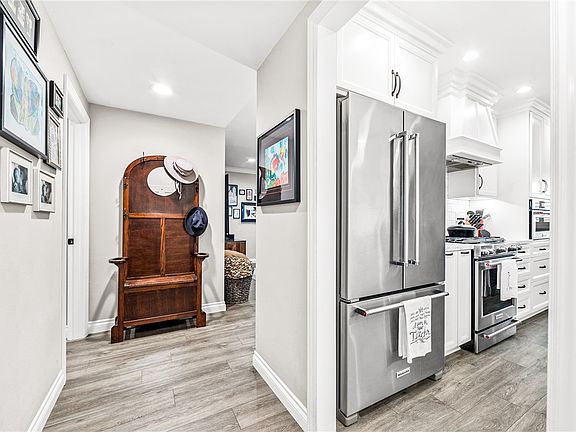 As you enter through the private courtyard, you'll be greeted by the charm of this residence. The foyer welcomes you with a custom storage closet providing ample space for all your organizational needs. To the right awaits a chef's kitchen, a culinary enthusiast's delight, featuring high-end stainless-steel appliances, quartz countertops, soft-close custom cabinetry, a large farmhouse sink, subway tile backsplash, recessed lighting, and luxury vinyl flooring.