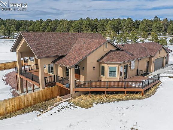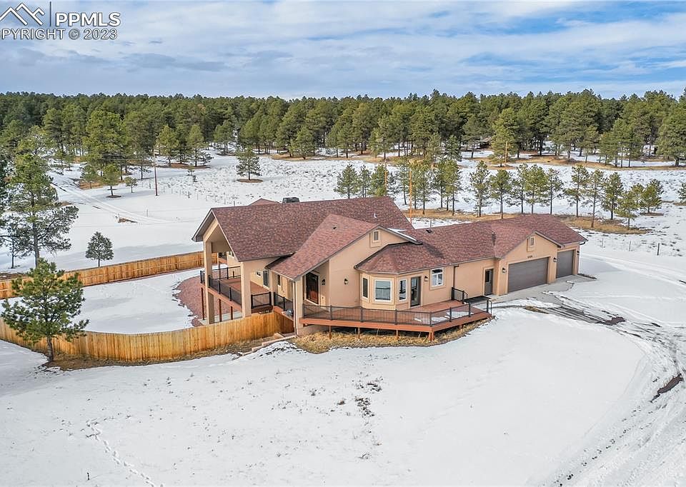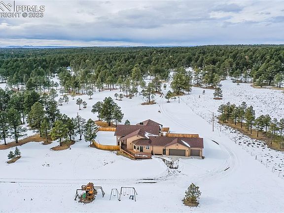 Built in 2020!! Custom rancher with over 5,000 square feet in desirable Black Forest w/ 5 acres of gorgeous mature pines and lush meadows surrounded by larger acreage properties. 6 bedrooms, 6 baths, huge 3 car finished attached garage with over 1,100 sq ft, finished walk-out basement, alder doors w/ beautiful stain throughout and a huge composite and metal deck spanning the entire length of the home. Gorgeous high end kitchen with 2 sinks, 2 dishwashers, a commercial grade refrigerator, 8 burner gas cook-top with custom hood, Quartz counters, farmhouse sink, huge island, double oven, 10x8 pantry and high end cabinetry. The property has no covenants or HOA so horses, chickens, RV parking and outbuildings are allowed. The property has natural gas and has a propane automatic generator in the event of power loss. Central air conditioning, radon mitigation system, Quartz counters throughout. Two laundry rooms both with sinks and tons of storage - one on the main level and one in the lower level. Dedicated dog wash shower. 5 of the 6 bedrooms are ensuite and have walk-in closets. The main level has the primary suite as well as secondary suite with private bath. The main primary suite has vaulted ceilings, a private composite deck, 12x9 walk-in closet and a spa like bath with shower, standalone tub, double vanity with two back-lit mirrors. Expansive great room with vaulted beamed ceilings, a wall of windows, a walk-out to the covered composite deck, gas fireplace w/ brick surround, custom built-ins with Quartz counters. Dining area with bay window and dedicated coffee bar with Quartz counters and matching cabinetry. Large mud room off of the garage with built-ins for storage and seating. Two large privacy fenced backyards. Walk-out lower level spacious great room w/ shiplap. High speed internet. Quick commute to Colorado Springs or Denver. Why wait for a new home when this one is ready and basically new? See this home quickly!!