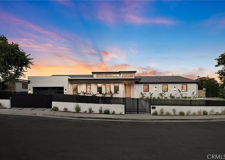 Perched high above the Valley in the hills of Encino, resides this stunning newly reimagined estate that offers dramatic city light views. Situated on a gated quarter-acre lot, this home features a contemporary exterior that gives way to a warm, inviting interior filled with rich woods, natural stone and high-end fixtures. The bright and airy open-concept floor plan is anchored by a gourmet chef’s kitchen equipped with top-of-the-line Thermador smart appliances and a massive waterfall island with a built-in table. Both the spacious living room and formal dining room boast oversized sliding glass doors that disappear into the wall, seamlessly extending your living space outside so you can take full advantage of indoor-outdoor living. A true entertainer’s paradise, the private backyard retreat offers a resort style pool with a large spa and baja shelf, along with a poolside cabana and expansive 874 sf rooftop patio – the perfect place to start your day as you watch the sun rise over the Valley. Inside, you’ll find four generously sized ensuite bedrooms, including a luxe primary suite that features dual walk-in closets and a sumptuous bathroom, complete with an oversized rainfall shower, soaking tub and double vanity. Additional highlights include a home office, dedicated laundry room, a smart home system with built-in speakers, high ceilings throughout and a two-car garage. Located south of the Boulevard within the top-rated Lanai School District, this exceptional property enjoys easy access to everything the Valley and Westside have to offer.
