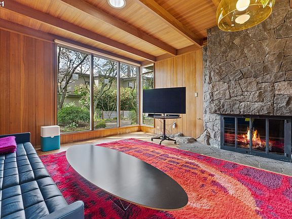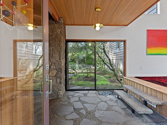 Amazing midcentury modern home with cedar plank vaulted ceilings, open floor plan, custom cabinetry and walls of windows. An artists delight. Ensuite primary bedroom with sitting area. 2 additional bedrooms. Nestled on a private, oversized lot with a natural garden and landscaping. 4 LO boat easements. 2 car garage, shop and extra storage area. Location, location!