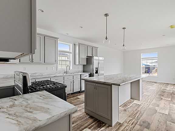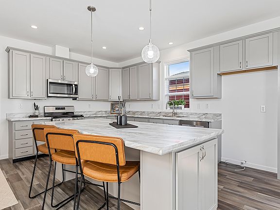 Large islandPendant lightingPulldown nozzleGarbage disposalWalk-in closetChic bathroomsStainless steel appliance suite