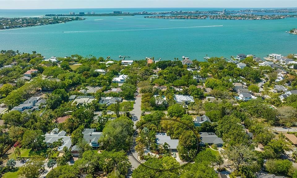Views of sunset colors, and lush tropical landscaping adorn this rarely available historic and iconic atomic ranch home located West of Trail in Bay View Heights. Midcentury modern elements, cantilever roof lines, expansive covered porch areas, a vaulted living room ceiling, and large front and back windows create an indoor-outdoor feeling, and provide cross ventilation, while adorning the soothing verdant setting. The house, nestled in a mature garden lined with white crushed shell meandering paths, offers a three-bedroom split plan, each with en-suite baths, plus a separate air-conditioned art studio/office overlooking the courtyard and surrounded by gardens. The main living area has vaulted ceilings and is opened to the den/family room area. The galley-style kitchen has cabinet doors with thick clear double reeded glass, a skylight, stainless steel countertops, and a vintage 1959 Frigidaire Custom Deluxe Flair range with a double oven and a pullout drawer. The adjacent utility room is great for storage and can be converted into a huge walk-in kitchen pantry addition or wine storage area. There is a formal dining room with lovely garden views. The master bedroom has a walk-through closet, and the en-suite bath has dual sinks. There is ample storage throughout the house as well as in the carport area. The trough fountain water garden, stocked with aquatic plants and goldfish, creates a reflective view of dappled light and meditative space visible from the den. Owned and appreciated by international landscape architects, the garden is rich with exotic flowering plants and trees, a lush xeriscape design with well water irrigation, and a designated area of raised planting garden beds for cultivating flowers and vegetables. Highly desirable location within two blocks to Sarasota Bay for kayaking, close proximity to Southside Village, Southside Elementary School and Sarasota Memorial Hospital. The property is located at one of Sarasota's highest points, and although you can see Sarasota Bay from the street, the house is not in a flood zone. New roof in 2019. Please note that the vintage Herman Miller Bubble Light fixtures are excluded from the sale. Property to be sold "As Is.”