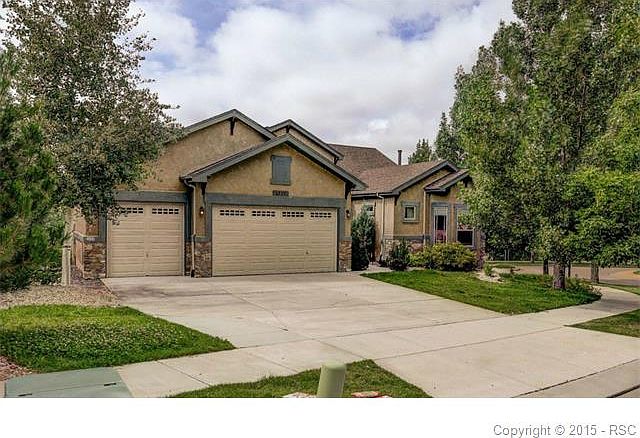 Stunning stucco and stone rancher on oversized corner lot with views overlooking the park to Pikes Peak. Features include vaulted wood ceiling in Great Room, a wall of windows, built-ins and fireplace. Separate Formal Dining Room, huge Kitchen with sunny breakfast nook that walks out to rear deck. Gourmet Kitchen with granite counters, stainless steel appliances, double ovens, huge center island, counter space and cabinetry to spare. Hardwood flooring in entry, kitchen and breakfast area. Built-in desk in breakfast room. Master suite includes a walkout to rear deck, 3 sided fireplace, 5 piece bath, separate shower and massive walk-in closet. Downstairs a double Family Room, 7x13 office area, two more bedrooms and a full bath. Oversized 3 car garage, home is air conditioned. Homes in this neighborhood exceed $800,000.Brand new carpet, some new paint, shows like a new home!!!