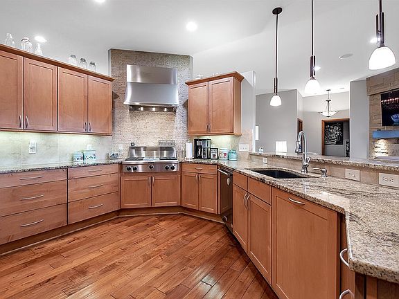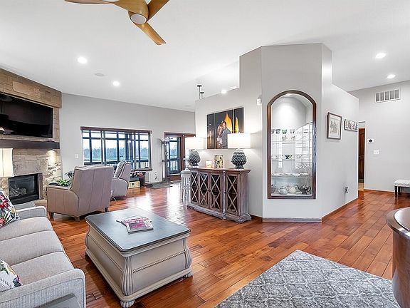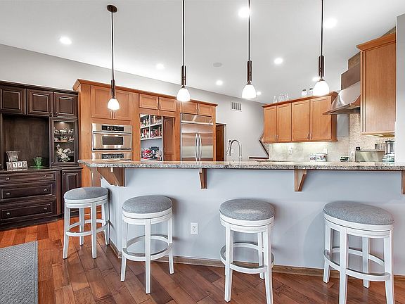Gorgeous custom built home located on the 18th Tee box at Sand Creek Station golf course. This 4 bedroom 3 bath home features two kitchens and a 5 car garage and will take your breath away the moment you enter. Hardwood floors throughout the formal dining, kitchen and front room greet you as does the gas fireplace that has Limestone from floor to ceiling. The master suite is beautiful and has a large walk in shower, bathtub and an amazing walk in closet and a second guest bedroom has views of the course along with a half bath. All of the lighting has been updated throughout the home and you will notice the deep pile luxury carpet and custom pattern carpet on the stairs that leads to the full basement which has a wet bar with small sink and two beer and wine refrigerators that stay with home. The large family room has a newly installed gas fireplace with remote and is large enough for a pool table. The two additional bedrooms (one could be a master) and there is another bath along with a huge storage room. This home is dual zoned for heating and cooling and has a whole house steam humidifier and water softener. Main floor laundry room and custom Kitchen Aid appliances make for a chefs dream kitchen with granite eating bar, lots of storage and newly installed efficient LED can lighting throughout and second prep kitchen which has a pass through window to the outdoor kitchen that has a refrigerator and warming drawer. The covered deck and screened in deck along with patio has quite the view of the 18th tee box on the golf course, large pond, train route and mature woods looking to the West and features a walkout basement below grade. Irrigation well and sprinkler system and flower beds that all feature perennials along with two large waterfalls are just amazing to watch! Think you seen it all? Wait until you walk into the finished 5 car garage that is both heated and air conditioned for a total of 971 square ft finished area not included in measurements on county or listing. Contact your favorite REALTOR today to see this one of a kind home today!
