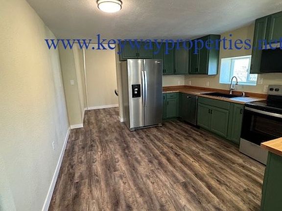 Step inside to find new flooring, fresh paint, and bright natural light flowing through the home. The spacious living area connects seamlessly to the updated kitchen, featuring stylish green cabinetry, butcher block countertops, stainless steel appliances, and modern pendant lightingperfect for cooking and entertaining.