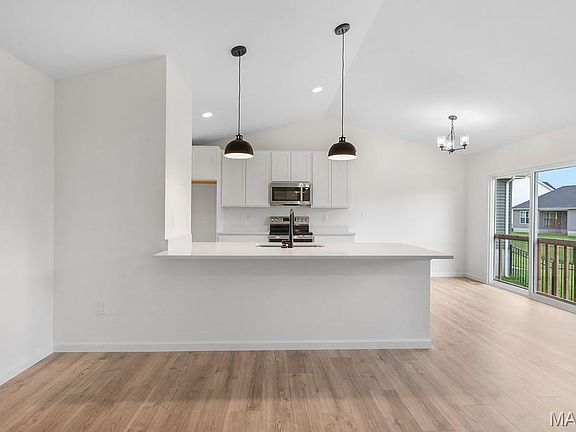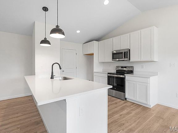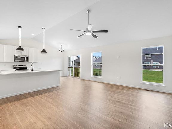 McBride Homes Aspen ranch-style home with 3BR & 2BA is available! Enjoy vaulted ceilings, 6ft windows, & beautiful wood laminate flooring in the main living area. The kitchen features beautiful painted white 42’’ tall kitchen cabinetry, quartz countertops, peninsula w/flush breakfast bar w/additional seating & stainless steel GE appliances. The master suite has large window, ceiling fan prewire, walk-in closet w/private bath w/5ft walk-in shower & adult height vanity w/double sinks. 2 additional bedrooms w/ceiling fan prewires & full bath. Extras include main floor laundry, coach lights at garage, & white two panel doors throughout. The LL features ¾ bath rough in for future finish. Polo Grounds has a barn-style clubhouse, playground, pickleball court, fire pit, scenic lake w/fountain & more. Located in Eureka near Highway 109/Hwy FF, in the Rockwood School District. Enjoy peace of mind w/McBride Homes’ 10 year builders warranty & incredible customer service! Similar photos shown.