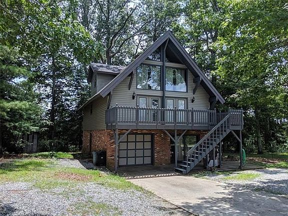 Great Location on this A Frame style home in Cajahs Mountain. Lower level is above grade and is partially finished. There are 2 additional rooms on lower level with fireplace insert that could be bedrooms or office/den area. Main level has large living room with high a-frame exposed beam ceilings, Bedroom, Bathroom and Kitchen. New flooring in main level living room and bathroom. Upper level has bedroom and full bath. Main level also has a front and a back decks on exterior. 1 acre lot with Outbuilding and large fenced in area with small pasture. Must see!