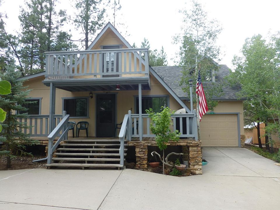 Fabulous, move-in, ready home with two bedrooms and a full bath on the lower level, and a huge bedroom/loft and a 3/4 bath upstairs. The home is completely remodeled and is available furnished with acceptable offer. Enjoy the porch in the cool pines during the summer, or live all year with central heat and a propane faux wood stove. It has a 1 1/2 car deep garage with high ceilings for extra storage and a work bench. It offers covered and uncovered porches and an upstairs balcony. Well landscaped with ponderosa pine and poplar trees. Circular concrete drive with room for a lot of vehicles, or an RV. Hike or ride your ATV in the surrounding Coconino National Forest which offers hundreds of miles of trails. Located in a desirable site built only area of the park. Easy to show.