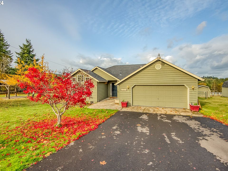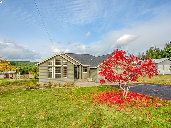 Nestled in a prime Vernonia location on a quiet, paved dead-end road, this property offers remarkable peace and tranquility in a scenic, forested setting on a ridge above town. Step inside to find a move-in-ready, single-level home filled with comfort and style. The hardwood entry leads to a spacious, vaulted living and family room, complete with a cozy natural gas stove for those chilly winter nights.The easy-care island kitchen features granite countertops, a stainless steel gas range and oven, and ample oak cabinetry with a pantry to meet all your storage needs. Enjoy serene forest views from the kitchen and bay-windowed breakfast nook. A generous dining room with double glass doors opens to a large deck, perfect for outdoor entertaining and taking in the views.The primary suite includes French doors leading to the back deck, a double vanity, a walk-in closet, and a skylight that bathes the bathroom in natural light. Additional amenities include a new forced-air heating system, a 10x20 storage shed with a loft, a 10x8 tool shed, an enclosed dog kennel, and a cozy chicken coop. Don’t miss the chance to make this beautiful homestead your own—come take a closer look!